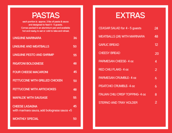 Get our delicious Built For You Options in larger formats: perfect for your next meeting, event, or family gathering. Best part- you can opt to have it hot and ready or to take and bake. The PASTA-bilities are endless!